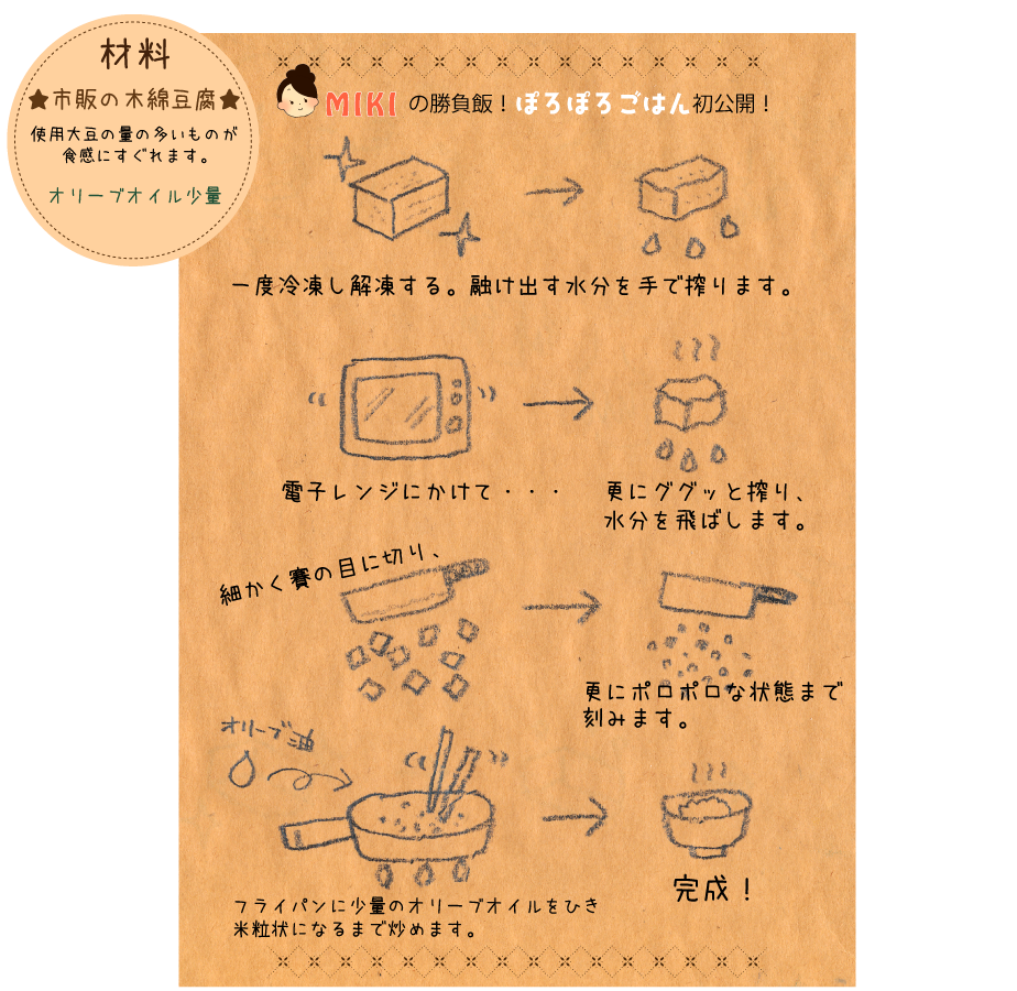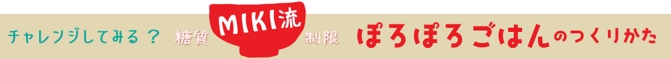 MIKIさんはこのたび、ご自身とお母さまのあくなき研究と努力のたまもの、「MIKI流、糖質制限食ぽろぽろごはん」のつくり方を伝授してくださいました。きっと、どなたかの役に立つ。そんな思いでのご提供です。※MIKIさんの糖質制限食とは ※レシピを見る